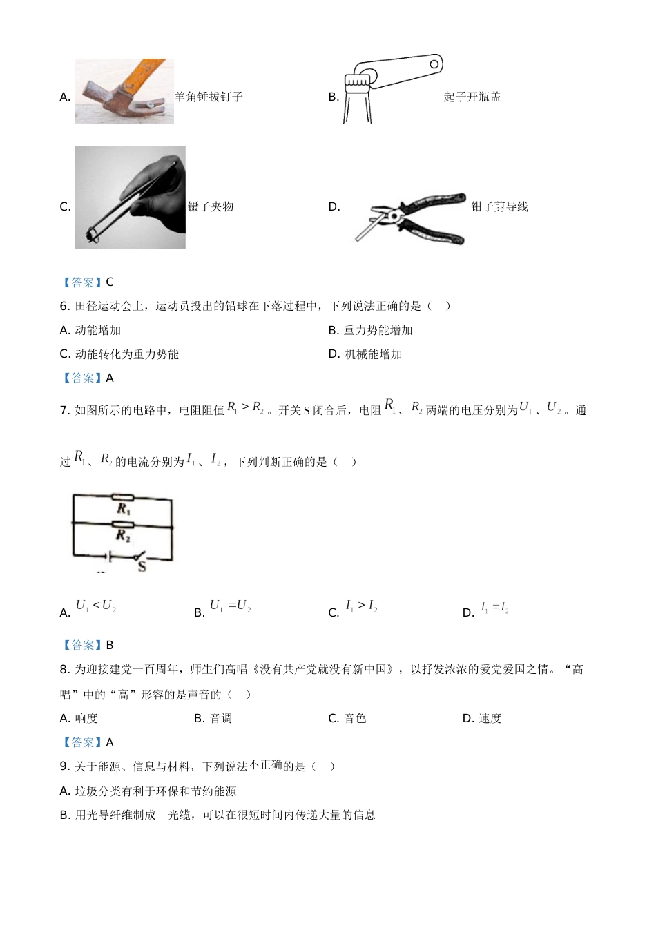 2021年怀化市初中学业水平考试试卷物理一、选择题(本题共15小题,共48分。1~12小题,每小题3分,在每小题给出的四个选项中只有一个选项符合题目要求;13~15小题,每小题给出四个选项中有多个选项符合题目要求,每小题全部选对得4分,选对但不全得2分,有选错的得0分。)1.下列是对九年级某学生的一些估测值,最接近实际的是()A.身高约为16cmB.正常体温约为36.8℃C.质量约为50gD.正常情况下1分钟脉搏跳动约200次【答案】B2.下列属于不可再生能源的是()A.风能B.水能C.太阳能D.天然气【答案】D3.如图所示是某四冲程汽油机工作循环中的一个冲程,它是()A.吸气冲程B.压缩冲程C.做功冲程D.排气冲程【答案】B4.下列现象中与分子热运动有关的是()A.余音绕梁B.尘土飞扬C.桂花飘香D.大雪纷飞【答案】C5.下列情境中的杠杆属于费力杠杆的是()A.羊角锤拔钉子B.起子开瓶盖C.镊子夹物D.钳子剪导线【答案】C6.田径运动会上,运动员投出的铅球在下落过程中,下列说法正确的是()A.动能增加B.重力势能增加C.动能转化为重力势能D.机械能增加【答案】A7.如图所示的电路中,电阻阻值。开关S闭合后,电阻、两端的电压分别为、。通过、的电流分别为、,下列判断正确的是()A.B.C.D.【答案】B8.为迎接建党一百周年,师生们高唱《没有共产党就没有新中国》,以抒发浓浓的爱党爱国之情。“高唱”中的“高”形容的是声音的()A.响度B.音调C.音色D.速度【答案】A9.关于能源、信息与材料,下列说法不正确的是()A.垃圾分类有利于环保和节约能源B.用光导纤维制成的光缆,可以在很短时间内传递大量的信息C.航空器材常采用密度大的合金,可以减小航空器的质量D.若用超导材料制造输电线可以大大降低电能损耗【答案】C10.如图所示,将两只相同的气球在自己的头发上摩擦后,就可以让一只气球在另一只气球上方“跳舞”。对该现象解释正确的是()A.摩擦的方法创造了电荷使两气球带了电B.摩擦的方法使气球分子发生转移而带电C.两气球因带了异种电荷而互相排斥D.这种相互排斥现象与验电器的两片金属箔张开时原理相同【答案】D11.某人用水平方向的力推物体,使物体在粗糙程度相同的水平面上做匀速直线运动,下列说法正确的是()A.人对物体的推力等于水平面对物体的摩擦力B.若增大推力,物体仍做匀速直线运动C.若撤去推力,物体所受摩擦力增大D.若撤去推力,物体的运动状态不会发生改变【答案】A12.在新型冠状病毒疫情防治期间,经常使用图甲所示的非接触式红外线测温枪。图乙是它的工作原理图,是定值电阻,R是红外线热敏电阻,其阻值随人体温度变化的图象如图丙所示。闭合开关S后,对该电路分析正确的是()A.体温越高,R的阻值越大B.体温越高,电压表的示数越大C.体温越低,R两端的电压越小D.体温越低,通过的电流越大【答案】B13.关于安全用电,下列说法正确的有()A.检修电路前切断电源B.在电线上晾晒衣服C.空气开关跳闸后,可立即合上D.使用试电笔辨别零线和火线时,手应接触笔尾金属体【答案】AD14.在如图所示的四个实例中,与小孔成像原理相同的有()A.玉带桥在水中的“倒影”B.日晷面上呈现晷针的影子C.筷子在水中“折断”D.手影游戏【答案】BD15.下列实验装置与探究内容相符的有()A.甲图可探究电流的磁效应B.乙图可探究发电机的工作原理C.丙图可探究发电机的工作原理D.丁图可探究电动机的工作原理【答案】AB二、填空题(本大题共8小题,每空1分,共16分。把答案写在答题卡横线上的空白处,不要求写出解题过程。)16.工程师把三峡水电站水库大坝设计成上窄下宽的形状,是因为水的深度越深,压强越______,(选填“大”或“小”)。当水库水深为100m时,坝底受到的水的压强是______Pa(已知,)。【答案】(1).大(2).1.0×10617.2021年5月15日,天问一号着陆巡视器成功着陆火星表面,它与地球控制台之间利用______(选填“电磁波”、“超声波”或“次声波”)来传递信息,地球控制台发出的指令经过2秒传播的距离是______m。【答案】(1).电磁波(2).6×108m18.寒冷的冬天,我们可以坐在电火箱内取暖,也可以跳绳使身体发热。前者是通过______的方式改变人体的内能,后者是通过______的方式改变人体...