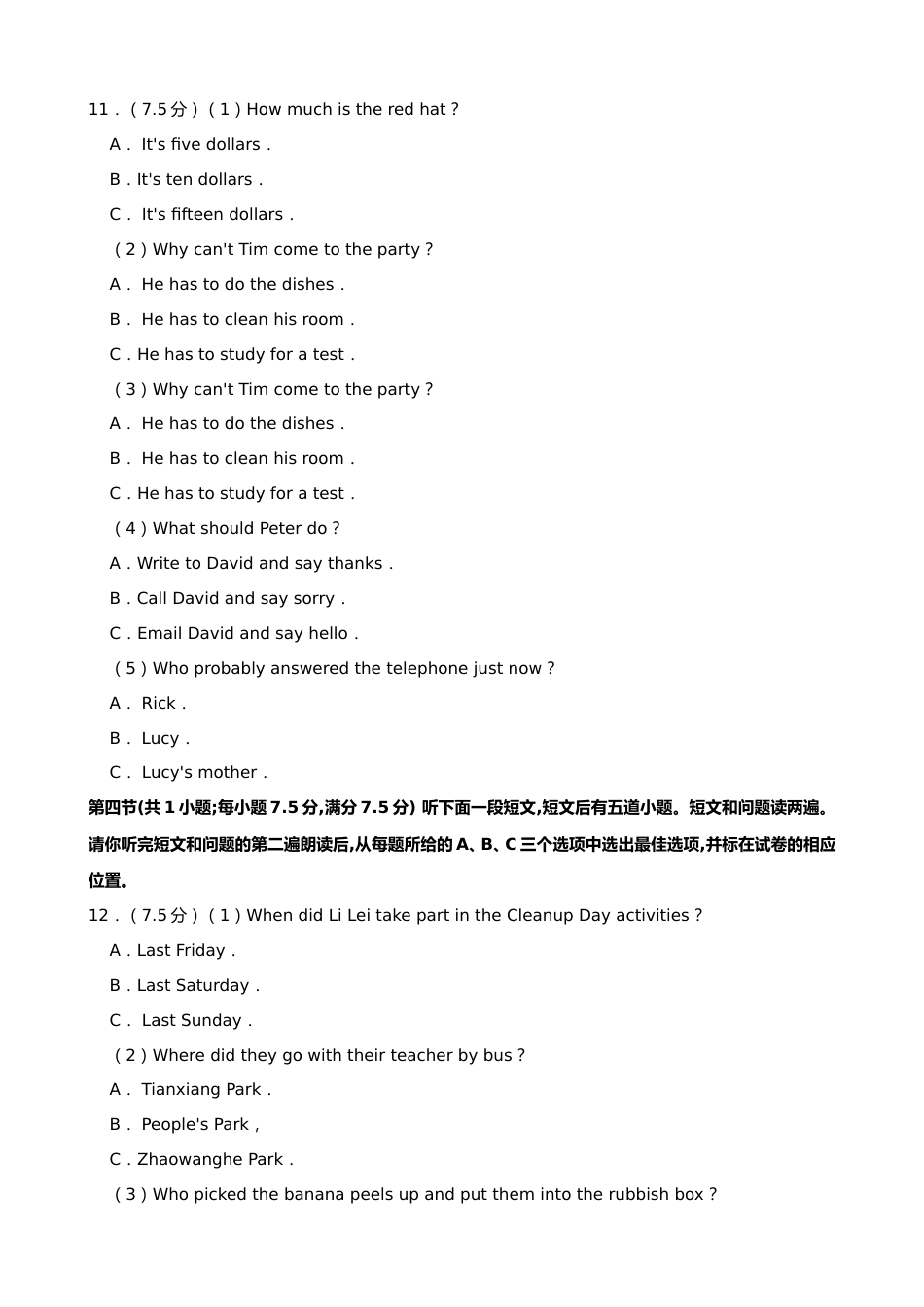 山东省菏泽市2019年中考英语试题选择题(共80分)一、听力(共四节,满分7.5分)做题时,先将答案标在试卷上,录音内容结束后,请将试卷上的答案转涂到答题卡上。第一节(共5小题;每小题1.5分,满分7.5分)听下面5个句子每个句子后有三幅图画,每个句子仅读一遍。请你从每题所给的A、B、C三个选项中选出与句子内容相符的图画,并标在试卷的相应位置。1.(1.5分)2.(1.5分)3.(1.5分)4.(1.5分)5.(1.5分)第二节(共5小题;每小题1.5分,满分7.5分)听下面5个句子,每个句子后有一道小题,每个句子读两遍,请你听完句子的第二遍朗读后,从每题所给的A、B、C三个选项中选出最佳答语并标在试卷的相应位置。6.(1.5分)A.You'rewelcome.B.Itdoesn'tmatter.C.Sorrytohearthat.7.(1.5分)A.Yes,Ican.B.No,Ican't.C.Sorry,Iwon't.8.(1.5分)A.Iwanttobeateacher.B.I'm12yearsold.C.I'dlikesomenoodles.9.(1.5分)A.It'sverybeautiful.B.Yes,Ihave.C.Soundsgood.10.(1.5分)A.Enjoythefullmoon.B.Watchtheboatraces.C.Makesnowmen.第三节(共1小题;每小题7.5分,满分7.5分)听下面5段对话,每段对话后有一道小题,每段对话和问题读两遍,请你听完对话和问题的第二遍朗读后,从每题所给的A、B、C三个选项中选出最佳选项,并标在试卷的相应位置。11.(7.5分)(1)Howmuchistheredhat?A.It'sfivedollars.B.It'stendollars.C.It'sfifteendollars.(2)Whycan'tTimcometotheparty?A.Hehastodothedishes.B.Hehastocleanhisroom.C.Hehastostudyforatest.(3)Whycan'tTimcometotheparty?A.Hehastodothedishes.B.Hehastocleanhisroom.C.Hehastostudyforatest.(4)WhatshouldPeterdo?A.WritetoDavidandsaythanks.B.CallDavidandsaysorry.C.EmailDavidandsayhello.(5)Whoprobablyansweredthetelephonejustnow?A.Rick.B.Lucy.C.Lucy'smother.第四节(共1小题;每小题7.5分,满分7.5分)听下面一段短文,短文后有五道小题。短文和问题读两遍。请你听完短文和问题的第二遍朗读后,从每题所给的A、B、C三个选项中选出最佳选项,并标在试卷的相应位置。12.(7.5分)(1)WhendidLiLeitakepartintheCleanupDayactivities?A.LastFriday.B.LastSaturday.C.LastSunday.(2)Wheredidtheygowiththeirteacherbybus?A.TianxiangPark.B.People'sPark,C.ZhaowanghePark.(3)Whopickedthebananapeelsupandputthemintotherubbishbox?A.Aboy.B.LiLei.C.LiLei'steacher.(4)Whatdidtheyhelptodointheend?A.Plantthetrees.B.ThrowtherubbishC.Watertheflowers.(5)Howdidtheyfeel?A.Tiredbuthappy.B.Tiredandterrible.C.Boredbutrelaxed.二、英语知识运用(共两节,满分10分)第一节单项填空(共10小题;每小题1分,满分10分)从A、B、C三个选项中,选出可以填入空白处的最佳选项并在答题卡上将该项涂黑。13.(1分)﹣Areyou____littleboyinthephoto,Tony?﹣Yes,it'sme.ThisphotowastakenwhenIwasonlythree.()A.aB.anC.the14.(1分)﹣Therelationsbetweenmyparentshavebecomedifficult.WhatshouldIdo?Youcoulddomorejobsaroundthehousesothattheyhavemoretimefor﹣proper____.()A.instrumentB.communicationC.community15.(1分)﹣Howisyourfriendgoingtothestation?﹣I'mnotsure.He____takeataxithere.()A.mustB.hastoC.may16.(1分)﹣Thisisareallyoldbike.﹣Yes,I____itforsevenyears.()A.havehadB.haveboughtC.Bought17.(1分)Bemore____nexttime,andyouwon'tmakethesamemistakeagain.()A.carelessB.carefulC.nervous18.(1分)____mygrandpaisover80yearsold,hestilllooksstrongandhealthy.()A.AlthoughB.BecauseC.Unless19.(1分)﹣Lucy,whenyouleavetheroom,please____thelight.﹣OK,Mom.()A.putoffB.turnoffC.turnup20.(1分)﹣Couldyoupleasetellme____?﹣Sure.Justgoalongthisstreetandyou'llfinditonyourleft.()A.w...