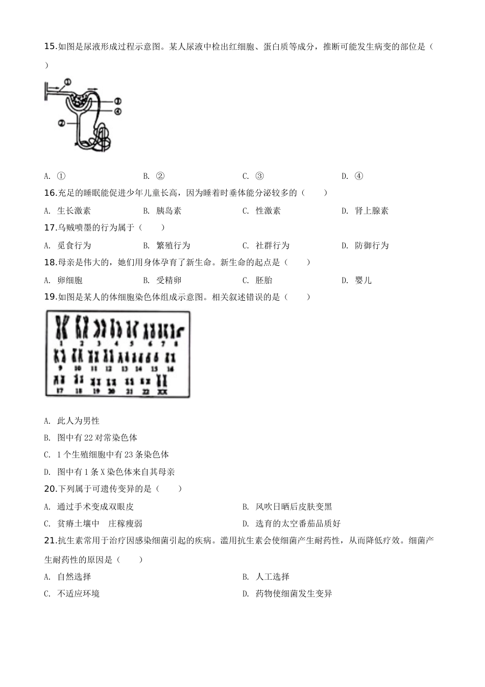 2020年江苏省南通市中考生物试卷一、选择题1.大雨过后,蚯蚓纷纷爬出洞穴。引起这一现象的主要非生物因素是()A.水分B.空气C.温度D.土壤2.晓玲为探究废旧电池对水质的影响,设计的实验方案如下表:项目对照组实验组加入无污染河水的量/毫升1500①加入7号废旧电池的数量/节不加1放入同种生长状况一致的金鱼的数量/条55该方案中的①应为()A.500B.1000C.1500D.20003.洋葱根尖分生区细胞数目的增多主要依赖细胞的()A.生长B.分裂C.分化D.成熟4.以植物体结构层次上看。枇杷果实属于()A.细胞B.组织C.器官D.植物体5.家庭种菜可以采用无土栽培,因为无土栽培培养液中含有植物生长必需的无机盐。其中被称为植物营养“三要素”的是()A.氮、磷、钾B.氮、锌、磷C.铁、锌、钾D.硼、铁、磷6.如皋长青沙的西瓜品质优良。是深受人们喜爱的消暑佳品,西瓜中能提供能量的营养物质主要是()A.水分B.无机盐C.维生素D.糖类7.如图是人类消化系统局部结构示意图,图中消化食物和吸收营养的主要器官是()A.①B.②C.③D.④8.小静同学观察了校园里的部分植物,其中以下属于被子植物的是()A.银杏B.水杉C.侧柏D.石榴9.下列动物中,生殖方式为胎生、哺乳的是()A.大黄鱼B.扬子鳄C.狼山鸡D.金丝猴10.在观察鲫鱼适应水中生活的特征时,吸取适量稀释的红墨水,滴在鲫鱼口的前方。会看到红墨水从鳃盖后缘流出,说明鲫鱼的呼吸器官是()A.口B.鳃C.鳞片D.侧线11.如图表示肺泡与外界、肺泡与毛细血管进行气体交换的过程,图中字母代表气体,下列述中正确的是()A.a、c代表氧气B.b、d代表二氧化碳C.a代表氧气,b代表二氧化碳D.c代表氧气,d代表二氧化碳12.乳酸杆菌是一种细菌,可用来制作酸奶和泡菜。与洋葱鳞片叶表皮细胞相比,乳酸杆菌不具备的结构是()A.细胞壁B.细胞膜C.细胞质D.成形的细胞核13.下表为某动物园多种鳄鱼名称的对照表,其中亲缘关系最近的两种鳄鱼是()俗名扬子鳄非洲鳄长吻鳄密西短吻鳄学名AlligatorsinensisCrocodilusuiloticusGarialisgangeticusAlligatormississippiensisA.扬子鳄和长吻鳄B.扬子鳄和密西短吻鳄C.非洲鳄和长吻鳄D.非洲鳄和密西短吻鳄14.“花褪残红青杏小”,形成小青杏的有性生殖过程是()A.开花、传粉、受精、结果B.传粉、受精、开花、结果C.开花、受精、传粉、结果D.开花、受精、传粉、结果15.如图是尿液形成过程示意图。某人尿液中检出红细胞、蛋白质等成分,推断可能发生病变的部位是()A.①B.②C.③D.④16.充足的睡眠能促进少年儿童长高,因为睡着时垂体能分泌较多的()A.生长激素B.胰岛素C.性激素D.肾上腺素17.乌贼喷墨的行为属于()A.觅食行为B.繁殖行为C.社群行为D.防御行为18.母亲是伟大的,她们用身体孕育了新生命。新生命的起点是()A.卵细胞B.受精卵C.胚胎D.婴儿19.如图是某人的体细胞染色体组成示意图。相关叙述错误的是()A.此人为男性B.图中有22对常染色体C.1个生殖细胞中有23条染色体D.图中有1条X染色体来自其母亲20.下列属于可遗传变异的是()A.通过手术变成双眼皮B.风吹日晒后皮肤变黑C.贫瘠土壤中的庄稼瘦弱D.选育的太空番茄品质好21.抗生素常用于治疗因感染细菌引起的疾病。滥用抗生素会使细菌产生耐药性,从而降低疗效。细菌产生耐药性的原因是()A.自然选择B.人工选择C.不适应环境D.药物使细菌发生变异22.吕四渔场是我国四大渔场之一,生活着海带、紫菜、鲳鱼、带鱼、梭子蟹、对虾等多种海洋生物。这体现了生物多样性的()A.物种多样性B.遗传多样性C.生态系统多样性D.形态结构多样性23.游泳要注意安全,谨防溺水。抢救溺水者时,下列措施不恰当的是()A.进行心肺复苏B.拨打“120”急救电话C.喂服速效救心丸D.清除口腔异物,进行人工呼吸24.新冠肺炎疫情期间,长时间居家生活,少数学生出现了焦虑情绪。下列做法不能有效缓解焦虑的是()A.沉迷网络游戏B.适度开展体育锻炼C.多和家人交流D.积极参加线上学习活动25.垃圾分类有利于节约和合理使用资源,成为生活新时尚。下列属于可回收垃圾的是()A.瓜皮果壳B.剩饭剩菜C.矿泉水瓶D.过期药品二、非选择题26.小明同学制作了人口腔上皮细胞临时装片,并用显微镜进行了观察。实验过程和...
