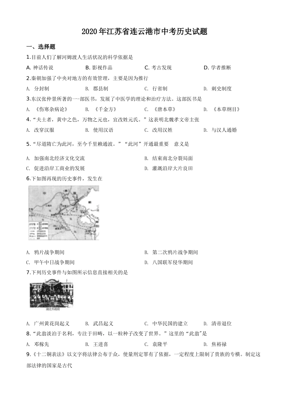 2020年江苏省连云港市中考历史试题一、选择题1.目前人们了解河姆渡人生活状况的科学依据是A.神话传说B.影视作品C.考古发现D.学者推断2.秦朝加强了中央对地方的有效管理,主要是因为推行A.分封制B.郡县制C.行省制D.刺史制度3.东汉张仲景所著的一-部医书,发展了中医学的理论和治疗方法。这部医书是A.《伤寒杂病论》B.《千金方》C.《唐本草》D.《本草纲目》4.“夫土者,黄中之色,万物之元也,宜改姓元氏。”这表明北魏孝文帝主张A.改穿汉服B.使用汉语C.改用汉姓D.与汉人通婚5.“尽道隋亡为此河,至今千里赖通波。”“此河”开通最重要的意义是A.加强南北经济文化交流B.结束南北分裂局面C.促进沿岸工商业的发展D.灌溉沿岸大片良田6.下如图再现的历史事件,发生在A.鸦片战争期间B.第二次鸦片战争期间C.甲午中日战争期间D.八国联军侵华期间7.下列历史事件与如图所示信息直接相关的是A.广州黄花岗起义B.武昌起义C.中华民国的建立D.清帝退位8.“此翁淡泊于名利,专注于田畴,以一粒种子改变了世界。”这里的“此翁"是A.邓稼先B.王进喜C.袁隆平D.焦裕禄9.《十二铜表法》以文字将法律公布于众,使量刑定罪有了依据,一定程度上限制了贵族的专横。制定这部法律的国家是古代A.埃及B.印度C.雅典D.罗马10.某同学来图书馆想借阅一部“打破了神创论,在生物科学领域掀起了一场伟大革命”的著作。如果你是图书管理员,应向其推荐A.《神曲》B.《哈姆雷特》C.《高老头》D.《物种起源》11.下面表格内容反映的是清朝A.巩固皇权的军事手段B.加强边疆管理的措施C.反抗侵略的英勇斗争D.主动对外交流的表现12.“在1940年下半年的这次大战中,八路军毙伤日、伪军2.5万多人,振奋了全国军民争取抗战胜利的信心。”这段材料评述的是A.平型关大捷B.台儿庄战役C.百团大战D.第三次长沙会战13.“钟山风雨起苍黄,百万雄师过大江。”诗中描述的这次战役A.赢得了反侵略斗争的完全胜利B.揭开人民解放军战略反攻序幕C.基本消灭了国民党军队的主力D.结束了国民党在大陆的统治14.“1954年,同仁堂的经理乐松生以大局为重,顺应历史潮流带头进行公私合营,受到毛泽东的高度赞扬。”与乐松生这一行为直接相关的是A.新中国成立B.三大改造C.中共八大D.八字方针15.“拿破仑主持制定了民法典,体现了自由平等和私有财产神圣不可侵犯等原则。”该法典制定的目的是A.奠定君主立宪制的基础B.建立分权制衡的联邦制C.巩固资产阶级革命成果D.加强国家对经济的干预16.1848年在伦敦出版的一-份宣言成为“所有国家千百万工人共同的纲领,全部社会主义文献中传播最广和最国际性的著作。”该宣言A.宣告了北美殖民地的独立B.标志着马克思主义的诞生C.促进了现代工厂制的出现D.调动了黑人奴隶的积极性17.如图信息表述了该组织的A.积极作用B.活动方式C.建立过程D.成立背景二、非选择题18.弘扬中华优秀传统文化是我们的历史责任。运用所学知识,回答下列问题。(1)弘扬中华优秀传统文化需要理解基本内涵。概括材料甲中老子的主要观点。结合所学知识,指出其产生的背景。(2)弘扬中华优秀传统文化需要把握时代特色。据材料乙、丙,分别指出这两种文学体裁盛行的朝代。结合所学知识,分析各自盛行的原因。(3)弘扬中华优秀传统文化需要结合时代需求。据材料丁,指出五四运动前后新文化运动指导思想的变化。举史实说明这种变化对中国历史的影响。19.中国道路是实现中华民族伟大复兴的必由之路。运用所学知识,回答下列问题。(1)立足国情是中国革命道路的迫切要求。据如图,写出第一一个革命根据地的名称。结合所学知识,说明此根据地的建立是怎样与中国国情相结合的。(2)明确战略目标是中国特色社会主义道路的特征之一。据材料甲,指出中国共产党的战略目标。结合所学知识,写出为实现该战略目标而采取的重大决策。(3)依据主要矛盾施策是社会主义现代化建设道路的重要方略。据材料乙,概括当前我国社会的主要矛盾。结合所学知识,写出在十九大上确立的党的指导思想。20.人类不断开创新的历史进程。运用所学知识,回答下列问题。(1)历史进程在全球互动中变迁。据材料甲,指出全球互动的成果。结合所学知识,写出1500年前后推动全球互动...