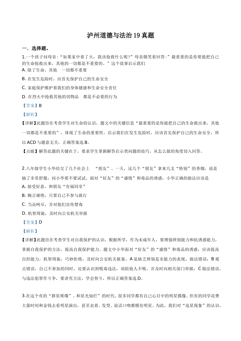 泸州道德与法治19真题一.选择题。1.一个孩子问母亲:“如果家中着了火,我该抢救什么呢?”母亲微笑着回答:”最重要的是你要能把自己的生命抢救出来,其他的一切都是不重要的。”这个故事启示我们A.除了生命,其他的一切都不重要B.在发生危险时,应首先保护自己的生命安全C.家庭保护维护着我们的身体健康和生命安全责任D.在烈火中抢救其他的切物品都是不必要的行为【答案】B【解析】【详解】此题旨在考查学生对生命的认识,题文中的关键信息“最重要的是你能把自己的生命救出来,其他一切都是不重要的”,体现了生命的重要性。启示我们在发生危险时,应该首先保护自己的生命安全,所以ACD与题意无关,正确答案选B。【点睛】解答此题的关键在于,要求学生掌握解答启示类问题的技巧,从怎么做的角度切入回答。2.八年级学生小华结交了几个社会上的“朋友”。一天,这几个“朋友”拿来几支“特别”的香烟,说是抽了非常舒服,问小华要不要试试。面对“好友”的“盛情”和毒品的诱惑,小华正确的做法应该是A.接受好意,和朋友“有福同享”B.婉言谢绝,只要自己不参与就行C.当众呵斥,并对他们宣传禁毒D.机智周旋,及时向公安机关举报【答案】D【解析】【详解】此题旨在考查学生对自我保护的认识,根据所学,作为未成年人,要增强辨别能力和抗诱惑能力,掌握自我保护的方法,提高自我保护能力。题文中小华面对“好友”的“盛情”和毒品的诱惑,应该提高自控能力,机智周旋,巧妙拒绝,及时向公安机关报案,A是缺乏辨别是非能力的表现,做法错误;B观点错误,自己不参加的同时,还要认识到吸毒违法,劝阻他人不吸,并及时向相关部门举报;C做法错误,与违法犯罪作斗争,要讲究方法,学会智斗,所以正确答案选D。3.在这个有的“群星堆璨”、和星光灿烂”的时代。很多同学都有自己心目中的明星偶像。但有的同学花费大量时间和金钱去看明星演出,甚至衣着、发型、说话口吻都模仿明星。为此,我们对“追星现象”的认识,正确的是①明星都有俊美的外表和高超的技能,是学习的榜样②要提高鉴别能力,认识到明星的优点和缺点,择善而从③用理性的态度看待明星,用批判的眼光审视偶像,克服盲目从众心理④明星能满足青少年自我的精神寄托和情感共鸣的需要,值得迷恋和崇拜A.①④B.②③C.②④D.③④【答案】B【解析】【详解】此题旨在考查学生对追星的认识,根据所学,喜欢明星是正常的心理现象,但是我们要学会理性追星,要提高鉴别能力,认识到明星的优点和缺点,择善而从;用理性的态度看待明星,用批判的眼光审视偶像,克服盲目从众心理等,①观点错误,我们要学习明星身上的优秀品质,不是俊美的外表;②③观点正确;④观点错误,迷恋明星会影响学习和生活,所以正确答案选B。【点睛】解答此题的关键在于,要求学生辩证的看待追星现象,既要学习明星身上的优点和长处,也要理智追星,避免盲从。4.下图漫画《“我不知道”》所反映的道理是①税收是国家财政收人的主要来源,具有强制性的特征②依法纳税,人人有责,公民不能只享有权利而不承担义务③公民应增强义务意识,自觉承担对国家和社会的责任④公民行使自由和权利时不得损害国家、社会和个人的利益A.①②B.①③C.②③D.③④【答案】B【解析】【详解】此题旨在考查学生对依法纳税的认识,根据所学,依法纳税是公民的基本义务。漫画中的明星不纳税的行为是违法的,因为税收是国家财政收入的主要来源,具有强制性的特征,公民应该增强义务意识,自觉承担对国家和社会的责任,①③观点正确;②观点错误,依法纳税是义务不是权利;④观点虽然正确,但不符合题意,所以正确答案选B。【点睛】解答此题的关键在于,要求学生认真观察漫画的标题、漫画中的文字和人物表现,理解漫画的寓意,找到与教材知识的结合点,从税收的重要性回答即可。5.“我可以挥动拳头,但是绝不能碰到另一个人的鼻子。”这是因为①公民在法律面前一律平等②任何权利都是有范围的,不能滥用权利③权利是宪法的核心内容,要尊重他人的权利④公民行使权利不能超越它本身的界限A.①②B.①③C.②③D.②④【答案】D【解析】【详解】此题旨在考查学生对依法行使权利的认识,题文中...