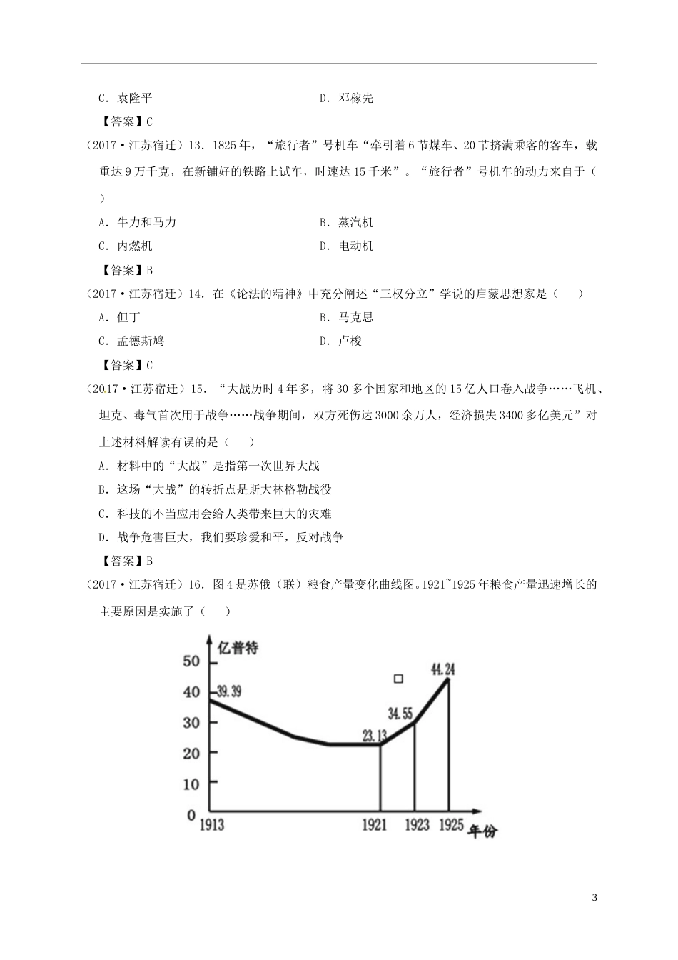江苏省宿迁市2017年中考历史试题一、单项选择题:本大题共20小题,每小题1.5分,共30分。(2017·江苏宿迁)1.改革常常伴随着利益格局的调整。按照商鞅变法的规定,应该获得奖励的人有()①勤于耕织的人②经商的人③战场立功的人④固守传统的贵族A.①③B.①④C.②③D.②④【答案】A(2017·江苏宿迁)2.图3所反映的是()A.张骞通西域B.丝绸之路C.郑和下西洋D.玄奘【答案】B(2017·江苏宿迁)3.唐太宗是中国古代杰出的帝王。下列史实与他密切相关的是()A.创立皇帝制B.颁布“推恩令”C.贞观之治D.设宣政院管理吐蕃【答案】C(2017·江苏宿迁)4.1661年,郑成功致书荷兰总督揆一:“______者,中国之土地也,久为贵国所踞,今余既来索,则当归我。”横线处应填入()A.雅克萨B.台湾C.澳门D.新疆【答案】B(2017·江苏宿迁)5.近代,中国人进入日本在苏州开设的工厂里做工,这种现象最早可能发生在()A.《南京条约》签订后B.第二次鸦片战争后C.《马关条约》签订后D.《辛丑条约》签订后1【答案】C(2017·江苏宿迁)6.李鸿章组建的北洋舰队是中近代史上哪场历史运动的产物()A.洋务运动B.戊戌变法C.辛亥革命D.新文化运动【答案】A(2017·江苏宿迁)7.下列口号中,最能体现五四运动“反帝反封建”性质的是()A.“打倒列强,除军阀”B.“取消二十一条”C.“外争国权,内除国贼”D.“拒绝在巴黎和会上签字”【答案】C(2017·江苏宿迁)8.“井冈山,两件宝,历史红,山林好。”其中“历史红”的主要依据是()A.中国共产党诞生地B.南昌起义爆发地C.长征胜利会师所在地D.创建了第一个农村革命根据地【答案】D(2017·江苏宿迁)9.据日军《步兵第10团战斗详报》中记载,台儿庄中国守军“决死奋战之状历历在目”,“士兵依靠堑壕顽强抵抗直到最后”。台儿庄中国守军的总指挥是()A.叶挺B.彭德怀C.张学良D.李宗仁【答案】D(2017·江苏宿迁)10.最早把毛泽东思想确定为党的指导思想的会议是()A.遵义会议B.中共七大C.第一届全国人民代表大会D.中共十五大【答案】B(2017·江苏宿迁)11.“史论结合”是学习历史的基本要求。下列史实与结论对应不当的是()A.《双十协定》的签订,维护了国家的和平与稳定B.三大改造的完成,标志着我国开始进入社会主义初级阶段C.1972年尼克松访华,中美关系开始走向正常化D.“四人帮”被粉碎,标志“文化大革命”结束【答案】A(2017·江苏宿迁)12.被誉为“杂交水稻之父”的是()A.黄继光B.焦裕禄2C.袁隆平D.邓稼先【答案】C(2017·江苏宿迁)13.1825年,“旅行者”号机车“牵引着6节煤车、20节挤满乘客的客车,载重达9万千克,在新铺好的铁路上试车,时速达15千米”。“旅行者”号机车的动力来自于()A.牛力和马力B.蒸汽机C.内燃机D.电动机【答案】B(2017·江苏宿迁)14.在《论法的精神》中充分阐述“三权分立”学说的启蒙思想家是()A.但丁B.马克思C.孟德斯鸠D.卢梭【答案】C(2017·江苏宿迁)15.“大战历时4年多,将30多个国家和地区的15亿人口卷入战争……飞机、坦克、毒气首次用于战争……战争期间,双方死伤达3000余万人,经济损失3400多亿美元”对上述材料解读有误的是()A.材料中的“大战”是指第一次世界大战B.这场“大战”的转折点是斯大林格勒战役C.科技的不当应用会给人类带来巨大的灾难D.战争危害巨大,我们要珍爱和平,反对战争【答案】B(2017·江苏宿迁)16.图4是苏俄(联)粮食产量变化曲线图。1921~1925年粮食产量迅速增长的主要原因是实施了()3A.农奴制改革B.战时共产主义政策C.新经济政策D.赫鲁晓夫改革【答案】C(2017·江苏宿迁)17.第二次世界大战期间,为了对付共同的敌人——法西斯,遭受侵略的国家不断加强联合并于1942年结成了()A.欧盟B.三国同盟C.联合国D.国慰反法西斯同盟【答案】D(2017·江苏宿迁)18.法国前总统吉斯卡尔德斯坦言称:“一个反对美国的欧洲是不可想象的,一个美国庇护下的欧洲是不能接受的。我希望一个站起来的欧洲。”其意图在于()A.建立一个强大的单边主义的欧洲B.努力构建一个统一的欧洲C...