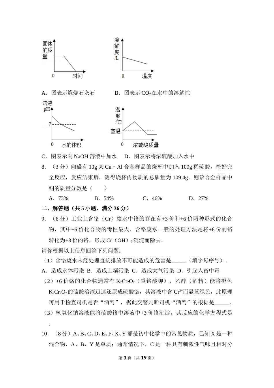 2017年四川省德阳市中考化学试卷一、选择题(共8小题,每小题3分,满分24分)1.(3分)中华民族的发明创造为人类文明进步做出了巨大贡献。下列古代发明及应用中,不涉及化学变化的是()A.陶瓷烧制B.火药使用C.粮食酿醋D.活字印刷2.(3分)草酸(H2C2O4)是一种有机酸,其水溶液呈酸性,它广泛分布于植物、动物和真菌体中,并在不同的生命体中发挥不同的功能.下列有关草酸的叙述正确的是()A.其中碳元素的化合价为+4B.氢元素和氧元素的质量比为1:32C.一个草酸分子由8个元素构成D.其溶液中滴加酚酞试液时显红色3.(3分)二氧化碳在一定条件下可转化为重要的化工原料乙烯,其反应的微观过程如图所示。下列有关叙述中正确的是()A.碳原子结构示意图为B.二氧化碳和乙烯均属于氧化物C.反应前后原子种类和数目均不变第1页(共19页)D.参加反应两种分子的个数比为4:14.(3分)下列图示的实验操作正确的是()A.量筒读数B.移开蒸发皿C.倾倒液体D.测定溶液的pH5.(3分)实验室有一包含有少量氯化钠杂质的硝酸钾固体,某校化学兴趣小组的同学为了得到纯净的硝酸钾,设计了如图所示的操作,下列有关分析中正确的是()A.操作Ⅰ~Ⅲ分别是溶解、加热蒸发、过滤B.操作Ⅰ是过滤,将氯化钠固体从溶液中分离除去C.操作Ⅱ是加热浓缩,趁热过滤,除去杂质氯化钠D.操作Ⅲ是过滤,将硝酸钾晶体从溶液中分离出来6.(3分)下列实验方案不能够达到相应实验目的是()选项实验目的实验方案A比较Fe、Cu和Ag的金属活动性将铁粉分别浸入CuSO4溶液和AgNO3溶液B除去CO中的少量CO2混合气体依次通过澄清石灰水和浓硫酸C实验室制取CO2用大理石和稀盐酸D区分蚕丝和人造纤维灼烧A.AB.BC.CD.D7.(3分)下列图象表示的对应关系正确的是()第2页(共19页)A.图表示煅烧石灰石B.图表示CO2在水中的溶解性C.图表示向NaOH溶液中加水D.图表示将浓硫酸加入水中8.(3分)向盛有10g某Cu﹣Al合金样品的烧杯中加入100g稀硫酸,恰好完全反应,反应结束后,测得烧杯内物质的总质量为109.4g.则该合金样品中铜的质量分数是()A.73%B.54%C.46%D.27%二、解答题(共5小题,满分36分)9.(6分)工业上含铬(Cr)废水中铬的存在有+3价和+6价两种形式的化合物,其中+6价化合物的毒性最大.含铬废水一般的处理方法是将+6价的铬转化为+3价的铬,形成Cr(OH)3沉淀而除去.请你根据以上信息回答下列问题:(1)含铬废水未经处理直接排放不可能造成的危害是(填字母序号).A.造成水体污染B.造成土壤污染C.造成大气污染D.引起人畜中毒(2)+6价铬的化合物通常有K2Cr2O7(重铬酸钾),乙醇(酒精)能将橙色K2Cr2O7的硫酸溶液迅速还原成硫酸铬,其溶液中含Cr3+而显蓝绿色,此原理可用于检查司机是否“酒驾”,据此交警判断司机“酒驾”的根据是.(3)氢氧化钠溶液能将硫酸铬中溶液中+3价铬沉淀,其反应的化学方程式是.10.(8分)A、B、C、D、E、F、X、Y都是初中化学中的常见物质,已知X是一种混合物,A、B、Y是单质;通常情况下,C是一种具有刺激性气味且相对分第3页(共19页)子质量为17的气体,D、E是含有相同元素的氧化物,它们之间有如下转化关系。请你回答下列问题:(1)X的名称是。(2)B与Y反应的条件是。(3)E+氧化铁→D的化学方程式是。(4)C+D+饱和食盐水→F的化学方程式是。11.(8分)实验室中有一包由KCl、MgSO4和CaCl2组成的固体混合物,某校研究性学习小组的同学为了除去其中的MgSO4和CaCl2,得到纯净的KCl,设计如下实验方案.请你回答下列问题:(1)X溶液与Ba(OH)2溶液反应的化学方程式是,该反应的基本反应类型是.(2)Y溶液中溶质的化学式是.(3)该实验中盐酸的作用是.12.(10分)如图是实验室制取气体的发生装置和气体收集装置。第4页(共19页)请你回答下列问题:(1)仪器a的名称是。(2)实验室用过氧化氢溶液制取氧气,其反应的化学方程式是,若从控制反应速率和节约药品的角度考虑,应选择的发生装置是(填字母编号)。(3)实验室若用氯酸钾和二氧化锰(作催化剂)制取氧气,可选择装置C作发生装置,其反应的化学方程式是。(4)D、E、F、G都是实验...