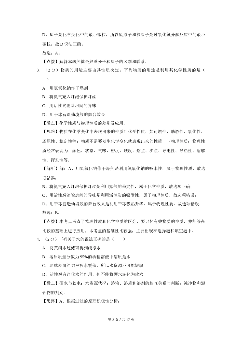 2017年宁夏中考化学试卷(教师版)一、选择题(1-11题每题2分,12-13题每题3分,共28分.只有一个选项符合题意)1.(2分)制造下列物品所用的主要材料,不需要通过化学反应就能得到的是()A.青铜剑B.大理石雕塑C.合成橡胶轮胎D.高强度降落伞【微点】化学变化和物理变化的判别.【思路】化学变化是指有新物质生成的变化,物理变化是指没有新物质生成的变化,化学变化和物理变化的本质区别是否有新物质生成;据此分析判断。【解析】解:A、青铜制作过程中有新物质生成,属于化学变化。B、大理石雕塑过程中只是状态发生改变,没有新物质生成,属于物理变化。C、合成橡胶制作过程中有新物质生成,属于化学变化。D、高强度降落伞制作过程中有新物质生成,属于化学变化。故选:B。【点拨】本题难度不大,解答时要分析变化过程中是否有新物质生成,若没有新物质生成属于物理变化,若有新物质生成属于化学变化。2.(2分)下列有关微粒的说法错误的是()A.一个氯原子得到一个电子成为阳离子B.公园里花香四溢,说明分子在不断运动C.要保持水的化学性质,就必须保持水分子不变D.氢原子和氧原子是过氧化氢分解反应中的最小微粒【微点】分子的定义与分子的特性.【思路】A、得电子带负电荷属于阴离子;B、根据分子在不断运动考虑;C、根据分子是保持物质化学性质的最小粒子考虑;D、根据原子是化学变化中的最小微粒考虑.【解析】解:A、得电子带负电荷属于阴离子,所以一个氯原子得到一个电子成为阴离子,故A错;B、分子在不断运动,构成花的分子在不断运动,才会花香四溢,故B说法正确;C、分子是保持物质化学性质的最小粒子,所以要保持水的化学性质,就必须保持水分子不变,故C说法正确;第1页/共17页D、原子是化学变化中的最小微粒,所以氢原子和氧原子是过氧化氢分解反应中的最小微粒,故D说法正确。故选:A。【点拨】解答本题关键是熟悉分子和原子的区别和联系.3.(2分)物质的用途主要由其性质决定。下列物质的用途是利用其化学性质的是()A.用氢氧化钠作干燥剂B.将氮气充入灯泡保护灯丝C.用活性炭消除房间的异味D.用干冰营造仙境般的舞台效果【微点】化学性质与物理性质的差别及应用.【思路】物质在化学变化中表现出来的性质叫化学性质,如可燃性、助燃性、氧化性、还原性、稳定性等;物质不需要发生化学变化就表现出来的性质,叫物理性质;物理性质经常表现为:颜色、状态、气味、密度、硬度、熔点、沸点、导电性、导热性、溶解性、挥发性等。【解析】解:A、用氢氧化钠作干燥剂是利用氢氧化钠的吸水性,属于物理性质,故选项错误;B、将氮气充入灯泡保护灯丝是利用氮气的稳定性,属于化学性质,故选项正确;C、用活性炭消除房间的异味是利用活性炭的吸附性,属于物理性质,故选项错误;D、用干冰营造仙境般的舞台效果是利用干冰吸热升华,属于物理性质,故选项错误;故选:B。【点拨】本考点考查了物理性质和化学性质的区分,要记忆有关物质的性质,并能够在比较的基础上进行应用,本考点的基础性比较强,主要出现在选择题和填空题中。4.(2分)下列关于水的说法正确的是()A.将黄河水过滤可得到纯净水B.溶质质量分数为95%的酒精溶液中溶质是水C.地球表面约71%被水覆盖,所以水资源不可能短缺D.活性炭有净化水的作用,但不能将硬水转化为软水【微点】硬水与软水;水资源状况;溶液、溶质和溶剂的相互关系与判断;纯净物和混合物的判别.【思路】A、根据过滤的原理积极性分析;第2页/共17页B、根据溶质、溶剂的判断方法进行分析;C、根据地球水资源的现状进行分析;D、根据活性炭具有吸附性进行分析.【解析】解:A、过滤只能除去水中的不溶性固体杂质,不能除去硬水中的钙离子和镁离子,因此黄河水过滤后得不到纯净水,该选项说法不正确;B、质量分数为95%的酒精,是酒精溶于水中形成的,所以溶质是酒精,该选项说法不正确;C、地球表面约71%被水覆盖,但大部分是咸水,而淡水资源紧缺,所以水资源非常短缺,该选项说法不正确;D、活性炭有吸附作用,可以吸附色素和异味等,但不能将硬水转化为软水,该选项说法正确。故选:D。【点拨】掌握一些与生活密切...