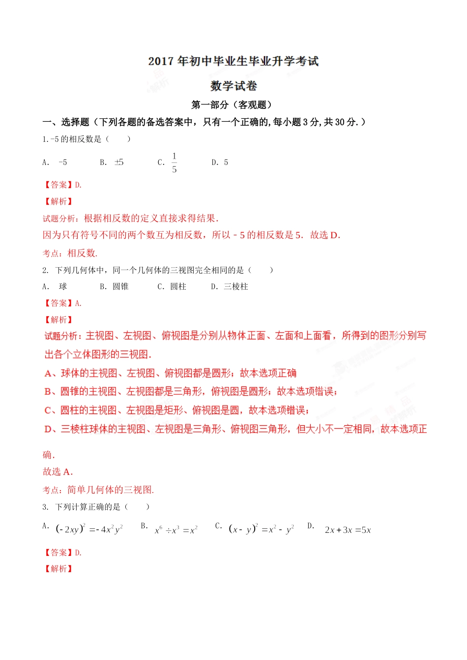 第一部分(客观题)一、选择题(下列各题的备选答案中,只有一个正确的,每小题3分,共30分.)1.-5的相反数是()A.-5B.C.D.5【答案】D.【解析】试题分析:根据相反数的定义直接求得结果.因为只有符号不同的两个数互为相反数,所以﹣5的相反数是5.故选D.考点:相反数.2.下列几何体中,同一个几何体的三视图完全相同的是()A.球B.圆锥C.圆柱D.三棱柱【答案】A.【解析】确.故选A.考点:简单几何体的三视图.3.下列计算正确的是()A.B.C.D.【答案】D.【解析】试题分析:根据同底数幂的除法、积的乘方、完全平方公式和合并同类项的运算法则分别进行计算即可得出答案.A、(﹣2xy)2=4x2y2,故本选项错误;B、x6÷x3=x3,故本选项错误;C、(x﹣y)2=x2﹣2xy+y2,故本选项错误;D、2x+3x=5x,故本选项正确;故选D.考点:同底数幂的除法;35:合并同类项;47:幂的乘方与积的乘方;4C:完全平方公式.4.为了解居民用水情况,小明在某小区随机抽查了30户家庭的月用水量,结果如下表:月用水量/4568910户数679521则这30户家庭的月用水量的众数和中位数分别是()A.6,6B.9,6C.9,6D.6,7【答案】B.【解析】考点:众数;中位数.5.若一次函数的图象经过第一、二、四象限,则下列不等式一定成立的是()A.B.C.D.【答案】D.【解析】试题分析:由于一次函数y=ax+b的图象经过第一、二、四象限,由此可以确定a<0,b>0,然后一一判断各选项即可解决问题. 一次函数y=ax+b的图象经过第一、二、四象限,∴a<0,b>0,∴a+b不一定大于0,故A错误,a﹣b<0,故B错误,ab<0,故C错误,<0,故D正确.故选D.考点:一次函数图象与系数的关系.6.如图,已知矩形纸片的一条边经过一个含30°角的直角三角尺的直角顶点,若矩形纸片的一组对边分别与直角三角尺的两边相交,,则的度数是()A.75°B.85°C.60°D.65°【答案】B.【解析】考点:平行线的性质.7.如图,在中,分别是的中点,以为斜边作,若,则下列结论不正确的是()A.B.平分C.D.【答案】C.【解析】由∠FEC=∠B=67.5°,∠FED=22.5°,求出∠DEC=∠FEC﹣∠FED=45°,从而判断C错误;在等腰Rt△ADC中利用勾股定理求出AC=CD,又AB=AC,等量代换得到AB=CD,从而判断D正确. AB=AC,∠CAB=45°,∴∠B=∠ACB=67.5°. Rt△ADC中,∠CAD=45°,∠ADC=90°,∴∠ACD=45°,AD=DC,∴∠ECD=∠ACB+∠ACD=112.5°,故A正确,学.科*网不符合题意; E、F分别是BC、AC的中点,∴FE=AB,FE∥AB,∴∠EFC=∠BAC=45°,∠FEC=∠B=67.5°. F是AC的中点,∠ADC=90°,AD=DC,∴FD=AC,DF⊥AC,∠FDC=45°, AB=AC,∴FE=FD,∴∠FDE=∠FED=(180°﹣∠EFD)=(180°﹣135°)=22.5°,∴∠FDE=∠FDC,∴DE平分∠FDC,故B正确,不符合题意; ∠FEC=∠B=67.5°,∠FED=22.5°,∴∠DEC=∠FEC﹣∠FED=45°,故C错误,符合题意; Rt△ADC中,∠ADC=90°,AD=DC,∴AC=CD, AB=AC,∴AB=CD,故D正确,不符合题意.故选C.考点:三角形中位线定理;等腰三角形的性质;勾股定理.8.如图,在菱形中,,它的一个顶点在反比例函数的图像上,若将菱形向下平移2个单位,点恰好落在函数图象上,则反比例函数解析式为()A.B.C.D.【答案】A.【解析】点A向下平移2个单位的点为(﹣a﹣a,a﹣2),即(﹣a,a﹣2),则,解得.故反比例函数解析式为.故选A.考点:反比例函数图象上点的坐标特征;菱形的性质;坐标与图形变化﹣平移.9.如图,在中,,点在上,,点是上的动点,则的最小值为()A.4B.5C.6D.7【答案】B.【解析】 DC=1,BC=4,∴BD=3,连接BC′,由对称性可知∠C′BE=∠CBE=45°,∴∠CBC′=90°,∴BC′⊥BC,∠BCC′=∠BC′C=45°,∴BC=BC′=4,根据勾股定理可得DC′=.故选B.考点:轴对称﹣最短路线问题;等腰直角三角形.10.如图,直线的解析式为,它与轴和轴分别相交于两点,平行于直线的直线从原点出发,沿轴的正方向以每秒1个单位长度的速度运动.它与轴和轴分别相交于两点,运动时间为秒(),以为斜边作等腰直角三角形(两点分别在两侧),若和的重合部分的面积为,则与之间的函数关系的图角大致是()A.B.C....