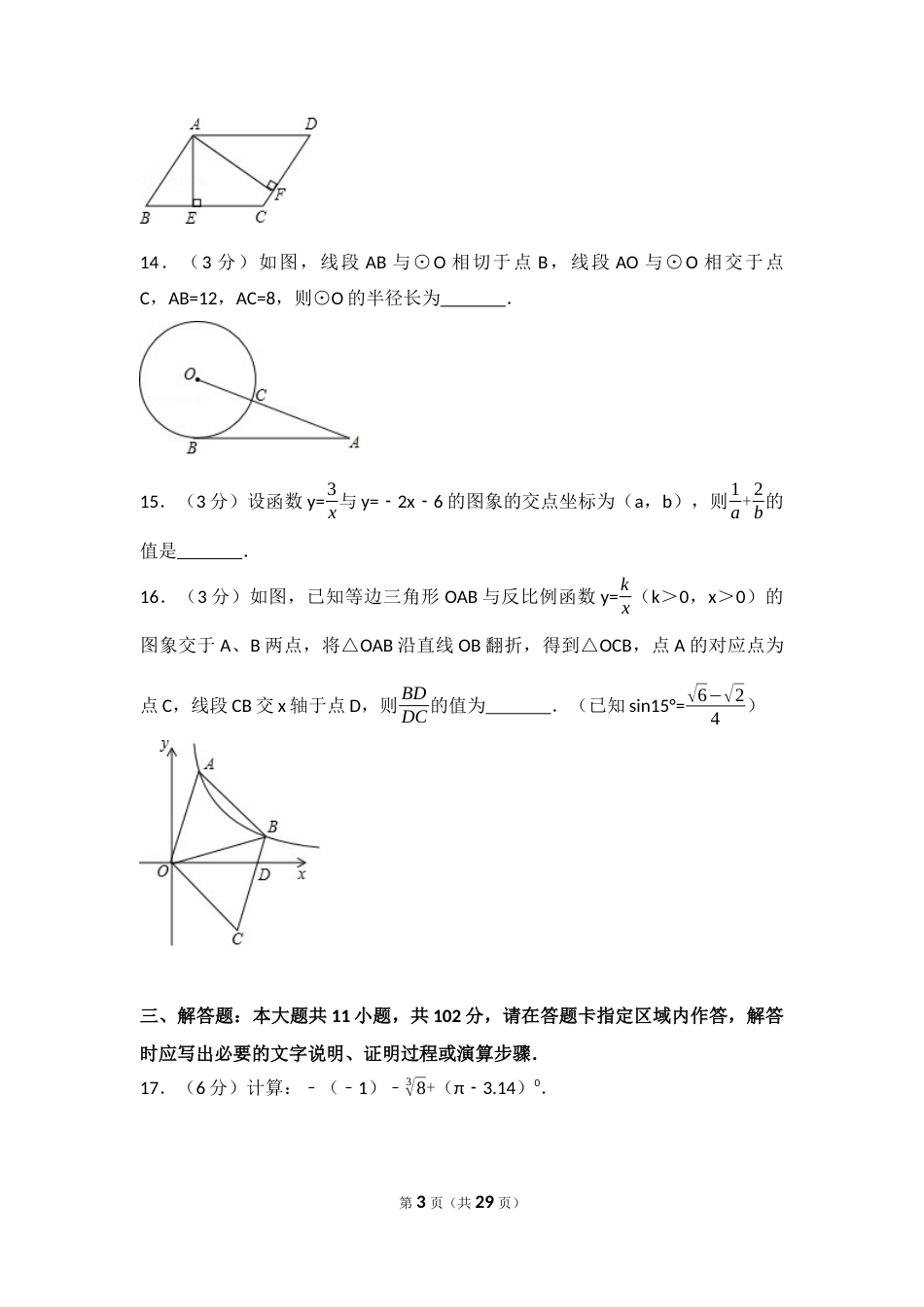 2017年江苏省连云港市中考数学试卷一、选择题:本大题共8小题,每小题3分,共24分,在每小题给出的四个选项中,只有一项是符合题目要求的,请将正确选项前的字母代号填涂在答题卡相应位置上.1.(3分)2的绝对值是()A.﹣2B.2C.﹣12D.122.(3分)计算a•a2的结果是()A.aB.a2C.2a2D.a33.(3分)小广,小娇分别统计了自己近5次数学测试成绩,下列统计量中能用来比较两人成绩稳定性的是()A.方差B.平均数C.众数D.中位数4.(3分)如图,已知△ABC∽△DEF,AB:DE=1:2,则下列等式一定成立的是()A.BCDF=12B.∠A的度数∠D的度数=12C.△ABC的面积△DEF的面积=12D.△ABC的周长△DEF的周长=125.(3分)由6个大小相同的正方体搭成的几何体如图所示,比较它的正视图,左视图和俯视图的面积,则()A.三个视图的面积一样大B.主视图的面积最小C.左视图的面积最小D.俯视图的面积最小第1页(共29页)6.(3分)关于√8的叙述正确的是()A.在数轴上不存在表示√8的点B.√8=√2+√6C.√8=±2√2D.与√8最接近的整数是37.(3分)已知抛物线y=ax2(a>0)过A(﹣2,y1)、B(1,y2)两点,则下列关系式一定正确的是()A.y1>0>y2B.y2>0>y1C.y1>y2>0D.y2>y1>08.(3分)如图所示,一动点从半径为2的⊙O上的A0点出发,沿着射线A0O方向运动到⊙O上的点A1处,再向左沿着与射线A1O夹角为60°的方向运动到⊙O上的点A2处;接着又从A2点出发,沿着射线A2O方向运动到⊙O上的点A3处,再向左沿着与射线A3O夹角为60°的方向运动到⊙O上的点A4处;…按此规律运动到点A2017处,则点A2017与点A0间的距离是()A.4B.2√3C.2D.0二、填空题:本大题共8小题,每小题3分,共24分,不需要写出解答过程,请把答案直接填写在答题卡相应位置上.9.(3分)分式1x−1有意义的x的取值范围为.10.(3分)计算(a2﹣)(a+2)=.11.(3分)截至今年4月底,连云港市中哈物流合作基地累计完成货物进、出场量6800000吨,数据6800000用科学记数法可表示为.12.(3分)已知关于x的方程x2﹣2x+m=0有两个相等的实数根,则m的值是.13.(3分)如图,在▱ABCD中,AE⊥BC于点E,AF⊥CD于点F.若∠EAF=56°,则∠B=.第2页(共29页)14.(3分)如图,线段AB与⊙O相切于点B,线段AO与⊙O相交于点C,AB=12,AC=8,则⊙O的半径长为.15.(3分)设函数y=3x与y=2x6﹣﹣的图象的交点坐标为(a,b),则1a+2b的值是.16.(3分)如图,已知等边三角形OAB与反比例函数y=kx(k>0,x>0)的图象交于A、B两点,将△OAB沿直线OB翻折,得到△OCB,点A的对应点为点C,线段CB交x轴于点D,则BDDC的值为.(已知sin15°=√6−√24)三、解答题:本大题共11小题,共102分,请在答题卡指定区域内作答,解答时应写出必要的文字说明、证明过程或演算步骤.17.(6分)计算:﹣(﹣1)﹣3√8+(π﹣3.14)0.第3页(共29页)18.(6分)化简1a2−a•a−1a.19.(6分)解不等式组{¿−3x+1<4¿3x−2(x−1)≤6.20.(8分)某校举行了“文明在我身边”摄影比赛.已知每幅参赛作品成绩记为x分(60≤x≤100).校方从600幅参赛作品中随机抽取了部分参赛作品,统计了它们的成绩,并绘制了如下不完整的统计图表.“文明在我身边”摄影比赛成绩统计表分数段频数频率60≤x<70180.3670≤x<8017c80≤x<90a0.2490≤x≤100b0.06合计1根据以上信息解答下列问题:(1)统计表中c的值为;样本成绩的中位数落在分数段中;(2)补全频数分布直方图;(3)若80分以上(含80分)的作品将被组织展评,试估计全校被展评作品数量是多少?第4页(共29页)21.(10分)为落实“垃圾分类”,环卫部门要求垃圾要按A,B,C三类分别装袋,投放,其中A类指废电池,过期药品等有毒垃圾,B类指剩余食品等厨余垃圾,C类指塑料,废纸等可回收垃圾.甲投放了一袋垃圾,乙投放了两袋垃圾,这两袋垃圾不同类.(1)直接写出甲投放的垃圾恰好是A类的概率;(2)求乙投放的垃圾恰有一袋与甲投放的垃圾是同类的概率.22.(10分)如图,已知等腰三角形ABC中,AB=AC,点D、E分别在边AB、AC上,且AD=AE,连接BE、CD,交于点F.(1)判断∠AB...