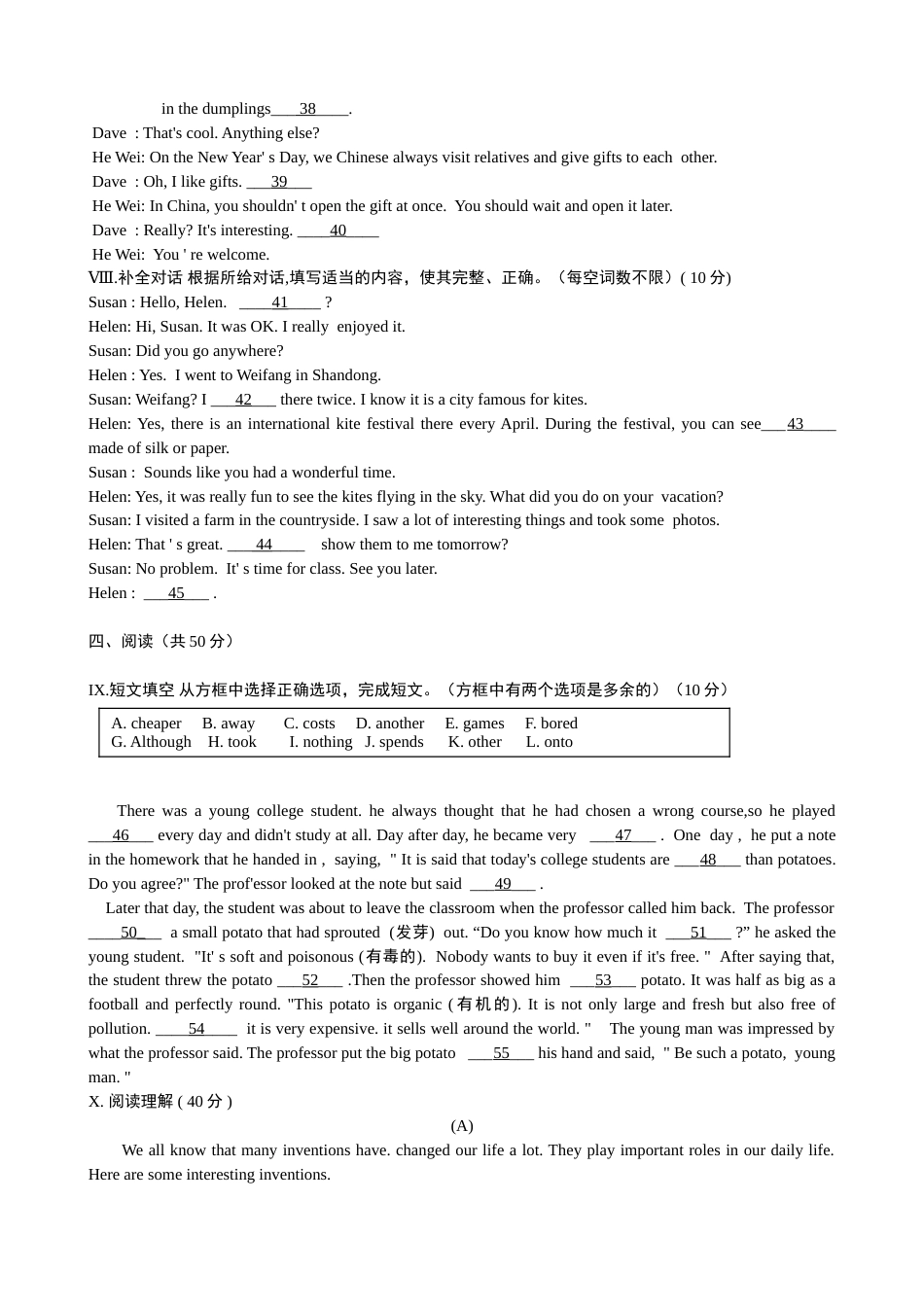 吉林省2017年初中毕业生学业考试英语试题一、听力(共20分)I.情景反应根据你所听到的句子,选择恰当的应答语。(5分)1.A.Goodafternoon,Mr.Li.B.Goodevening,Mr.Li.C.Goodmorning,Mr.Li.2.A.It'sfast.B.lt's90'clock.C.It'syourwatch.3.A.Ihaveacold.B.I'mlaura.C.Icandance.4.A.Heistall.B.Heiscute.C.Heis11yearsold.5.A.Twiceaweek.B.Fortwoweeks.C.Intwoweeks.Ⅱ.对话问答根据你所听到的对话及问题,选择正确答案。(5分)6.A.Countrymusic.B.Popmusic.C.Rockmusic.7.A.Wilndy.B.Snowy.C.Sunny.8.A.Hisson.B.Hisdaughter.C.Hiscousin.9.A.Nexttothepark.B.Acrossfromthepark.C.Infrontofthepark.10.A.Onfoot.B.Bycar.C.Bybus.Ⅲ.图片理解看图听描述,选择与你所听到的描述内容相符合的选项。(下列图中有一幅图片与描述内容无关)(5分)__11____12____13____14____15__Ⅳ.短文理解根据你所听到的短文内容,选择正确答案。(5分)16.WhenwillMikeleaveschool?A.InMay.B.InJune.C.InJuly.17.HowisMike'sschool?A.Bigandnice.B.Smallandnice.C.Bigandclean.18.WhatisMike'sfavoritesubject?A.Chinese.B.English.C.Math.19.WhocanMikeandhisclassmatesaskforhelpatschool?A.Theirteachers.B.Theirparents.C.Theirfriends.20.Wheredotheygoashelperseachterm?A.Tothefoodbank.B.Tothehospital.C.Tothezoo.x_k_b_1二、基础知识(共15分)V.句意填词根据所给句子,填入一个适当的单词,使句意完整。(5分)21.-IsthatJohn'sball?-No.it'smine._____________isunderthechair.22.Mulantookherfather's___________tofightinthearmy.23.Wearetryingtocomeup___________someideastosolvetheproblem.24.Ericisso___________thatherunstothekitchentodrinkwater.25.Thebookisalittleexpensive.Whynot________onefromthelibrary?Ⅵ.单项选择从每小题所给的三个选项中,选出一个正确答案。(10分)26.-Doyouknow______boyoverthere?Yes,heismybrother,LiLei.A.theB.anC.a27.Iwon'tgohome________therainstops.A.sinceB.soC.untilxkb128.You_________crossthestreetwhenthetrafficlightsarered.A.needn'tB.don'thavetoC.mustn't29.OdetoJoy(欢乐颂)isaTVplay________manypeoplelike.A.whyB.thatC.who30.BothLilyandLucy_________tothepartyyesterday,buttheydidn'tcomeatall.A.wereinvitedB.wasinvitedC.invited31.Itis_________knownthatmoreandmoreforeignersarelearningChineseculturenow.A.politelyB.loudlyC.widely32.________birdshavecomebackbecausetheenvironmentherebecomesbetterandbetter.A.ThousandsofB.ThousandofC.Thousands33.-Andy,Iwonder_________thenewsportsclothes.-Ofcoursebycreditcard.A.whatyoupaidforB.howyoupaidforC.whyyoupaidfor34.TheLeenagersoftenhelp________waterandfoodtothosepeopleinneed.A.putoutB.giveoutC.findout35.-Jeff,Iwilltakeanimportantexamtomorrow.A.Goodluck!B.Congratulations!C.Goodidea!三、交际运用(共15分)VII.完成对话从方框中选择正确选项。(方框中有一个选项与对话内容无关)(5分)Dave:Nicetomeetyou!I'mDavefromAmerica.HeWei:Nicetomeetyou,too!I'mHeWei,anexchangestudentfromChina.Dave:China?It'sagreatcountry.___36___HeWei:Really?Well,nextyear,youcancometomyhousefortheNewYear.Dave:OK.___37___HeWei:Ofcoursenot.OntheNewYear'sEve,wealwaysmakedumplingswithfamilyandsomecoinsareputA.Thankyoufortellingmesomuch.B.WhenIgetagift,couldIopenitrightnow?C.Wouldyoumindtellingmesomecustomsaboutthefestival?D.I'minterestedinChinesefestivals,especiallytheChineseNewYear.E.Thepersonwithcoinsislucky.F.Doyoulikecoins?inthedumplings___38____.Dave:That'scool.Anythingelse?HeWei:OntheNewYear'sDay,weChinesealwaysvisitrelativesandgivegiftstoeachother.Dave:Oh,Ilikegifts.___39___HeWei:InChina,youshouldn'topenthegiftatonce.Youshouldwaitandopenitlater.Dave:Really?It'sinteresting...