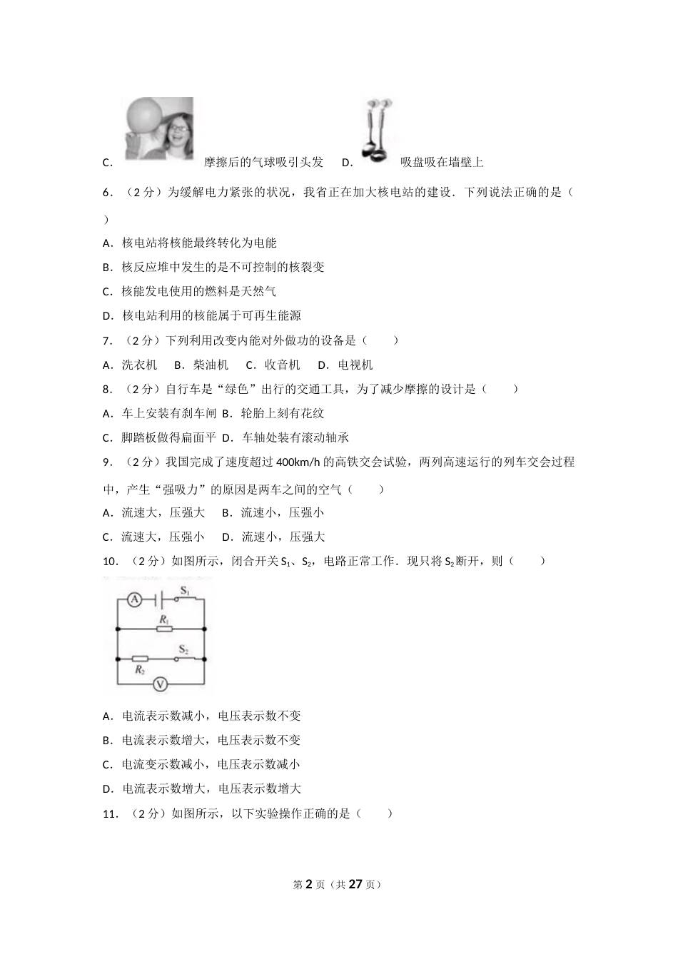 2017年福建省中考物理试卷一、选择题1.(2分)夏商时期,已有铜制的铃和皮质的鼓.人耳能分辨出铃声和鼓声是根据声音的()A.响度B.音调C.音色D.频率2.(2分)今年1月,我国发射的世界首颗量子科学实验卫星,完成了在轨测试任务.实验卫星与地面通信联系是利用()A.次声波B.无线电波C.红外线D.超声波3.(2分)下列做法符合安全用电常识的是()A.使用冰箱时,金属外壳未接地B.家庭电路中,开关接在零线上C.检修电路时,未断开总开关D.电线着火时,应先切断电源再救火4.(2分)战国时期,《墨经》中记载了影子的形成、平面镜的反射等光学问题.图中的光学现象与影子的形成原理相同的是()A.湖中倒影B.日食现象C.海市蜃楼D.雨后彩虹5.(2分)如图所示的“吸引现象”由静电引起的是()A.磁铁吸引硬币B.压紧的铅块互相吸引第1页(共27页)C.摩擦后的气球吸引头发D.吸盘吸在墙壁上6.(2分)为缓解电力紧张的状况,我省正在加大核电站的建设.下列说法正确的是()A.核电站将核能最终转化为电能B.核反应堆中发生的是不可控制的核裂变C.核能发电使用的燃料是天然气D.核电站利用的核能属于可再生能源7.(2分)下列利用改变内能对外做功的设备是()A.洗衣机B.柴油机C.收音机D.电视机8.(2分)自行车是“绿色”出行的交通工具,为了减少摩擦的设计是()A.车上安装有刹车闸B.轮胎上刻有花纹C.脚踏板做得扁面平D.车轴处装有滚动轴承9.(2分)我国完成了速度超过400km/h的高铁交会试验,两列高速运行的列车交会过程中,产生“强吸力”的原因是两车之间的空气()A.流速大,压强大B.流速小,压强小C.流速大,压强小D.流速小,压强大10.(2分)如图所示,闭合开关S1、S2,电路正常工作.现只将S2断开,则()A.电流表示数减小,电压表示数不变B.电流表示数增大,电压表示数不变C.电流变示数减小,电压表示数减小D.电流表示数增大,电压表示数增大11.(2分)如图所示,以下实验操作正确的是()第2页(共27页)A.手持量筒举离桌面读数B.以“1cm”刻度线处为测量起点C.杠杆在水平位置平衡时,拉力的力臂为lD.为使像成在光屏中心,只需调节烛焰中心和光屏中心在同一高度12.(2分)如图所示,体操运动员静止在平衡木上时,与运动员所受重力是一对平衡力的是()A.平衡木对运动员的支持力B.运动员对平衡木的压力C.平衡木受到的重力D.运动员对地球的吸引力13.(2分)在沙漠中,可以利用图所示的方法应急取水,此过程中发生的物态变化有(第3页(共27页))A.熔化凝华B.凝固汽化C.汽化液化D.熔化液化14.(2分)大老虎从静止开始加速追赶小羚羊,快追上时,羚羊突然急转弯逃脱了老虎的捕捉.在此过程中下列说法正确的是()A.老虎静止时没有惯性B.老虎加速过程惯性增大C.老虎惯性大不易转弯D.老虎惯性小不易转弯15.(2分)为了提高行车的安全性,有的汽车装有日间行车灯,如图所示.当汽车启动时,S1闭合,日间行车灯L1,立即亮起,再闭合S2,车前大灯L2也亮起.图所示的电路图中符合这一情况的是()A.B.C.、D.16.(2分)如图所示,将标有“3V”的灯泡L1和标有“6V3W”的灯泡L2串联在电路中,闭合开关S,其中只有一只灯泡正常发光,设小灯泡电阻不变,则L1两端的电压及通过L1的电流分别是()A.3V1AB.1.5V1A第4页(共27页)C.3V0.5AD.1.5V0.5A二、填空17.(2分)4月22日,货运飞船“天舟一号”与空间站“天空二号”成功对接.对接后,以“天宫二号”为参照物,“天舟一号”处于状态.由于外太空存在少量空气,“天空二号”运行时受到阻力,机械能(选填“变大”、“变小”或“不变”).18.(2分)如图所示,晚唐诗人高骈的《山亭夏日》,全诗各句都蕴含丰富的物理知识,其中“倒影”是光的现象.“一院香”是由于分子.19.(2分)如图所示,撬起瓶盖的起瓶器是属于杠杆(选填“省力”、“费力”或“等臂”),其支点是图中点.20.(2分)“福船”因由福建所造而得名,是古代海上丝绸之路的重要航运工具.如图所示,“福船”在大海上航行时,是利用风的能,船的总质量为2×105kg,则该船所受到的浮力是N.(g...