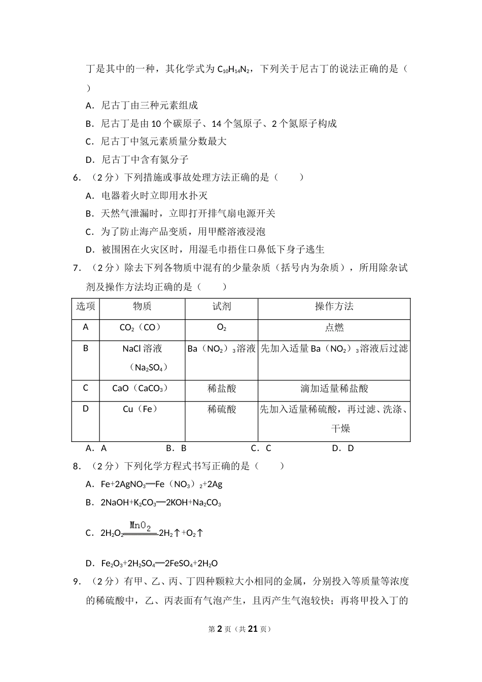 2014年四川省南充市中考化学试卷一、选择题(本大题共10小题,每小题2分。共20分)1.(2分)生活中的下列变化,属于物理变化的是()A.植物的光合作用B.燃放烟花C.蜡烛燃烧D.电灯通电发光2.(2分)今年南充市成为四川省空气质量重点监测城市,PM2.5是监测指标之一,PM2.5是大气中直径小于或等于2.5微米的可吸入颗粒,下列做法不会增大PM2.5监测结果的是()A.汽车排放尾气B.工厂排放烟尘C.太阳能发电D.露天焚烧垃圾3.(2分)下列实验操作中,正确的是()A.测溶液pHB.吸取液体药品C.闻气体的气味D.加热液体4.(2分)下列四种物质中,属于化合物的是()A.生铁B.冰水混合物C.食盐溶液D.液氧5.(2分)吸烟有害健康,香烟的烟气中含有几百种对人体有害的物质,尼古第1页(共21页)丁是其中的一种,其化学式为C10H14N2,下列关于尼古丁的说法正确的是()A.尼古丁由三种元素组成B.尼古丁是由10个碳原子、14个氢原子、2个氮原子构成C.尼古丁中氢元素质量分数最大D.尼古丁中含有氮分子6.(2分)下列措施或事故处理方法正确的是()A.电器着火时立即用水扑灭B.天然气泄漏时,立即打开排气扇电源开关C.为了防止海产品变质,用甲醛溶液浸泡D.被围困在火灾区时,用湿毛巾捂住口鼻低下身子逃生7.(2分)除去下列各物质中混有的少量杂质(括号内为杂质),所用除杂试剂及操作方法均正确的是()选项物质试剂操作方法ACO2(CO)O2点燃BNaCl溶液(Na2SO4)Ba(NO2)3溶液先加入适量Ba(NO2)3溶液后过滤CCaO(CaCO3)稀盐酸滴加适量稀盐酸DCu(Fe)稀硫酸先加入适量稀硫酸,再过滤、洗涤、干燥A.AB.BC.CD.D8.(2分)下列化学方程式书写正确的是()A.Fe+2AgNO3═Fe(NO3)2+2AgB.2NaOH+K2CO3═2KOH+Na2CO3C.2H2O22H2↑+O2↑D.Fe2O3+2H2SO4═2FeSO4+2H2O9.(2分)有甲、乙、丙、丁四种颗粒大小相同的金属,分别投入等质量等浓度的稀硫酸中,乙、丙表面有气泡产生,且丙产生气泡较快;再将甲投入丁的第2页(共21页)盐溶液中,甲的表面有丁析出,则这四种金属活动性顺序为()A.甲>乙>丙>丁B.丙>乙>甲>丁C.丙>乙>丁>甲D.丁>甲>乙>丙10.(2分)下列图象能正确反映其对应关系的是()ABCDA.电解水B.向H2SO4、MgSO4混合溶液中滴加NaOH固体C.两份完全相同的双氧水在有无MnO2情况下产生O2D.向接近饱和的KNO3溶液中加入KNO3固体二、完成下列各题(本大题包括4小题,共16分)11.(3分)用适当的数字和符号表示:(1)氮原子(2)2个二氧化硫分子(3)3个铝离子.12.(4分)(1)富含蛋白质的是,富含维生素的是(用序号填空).(2)厨房里有两种白色固体粉末,分别是食盐和纯碱,可以选用上述(填序号)来区分她们,产生现象的是纯碱,无明显现象的是食盐.13.(3分)根据如图中A、B、C三种物质的溶解度曲线,回答下列问题.(1)t2℃时,A、B、C三种物质的溶解度由大到小的顺序是(填物质序第3页(共21页)号).(2)t2℃时,30gA物质投入到50g水中所得到溶液的质量为g.(3)t2℃时,A、B、C三种物质的饱和溶液降温到t1℃,三种溶液溶质量分数由大到小的顺序是(填序号).14.(6分)(1)学校运动会上短跑项目“发令枪”里的火药成分为KClO3,MnO2和红磷,当扣动扳机时,①撞针撞击火药,产生热量使KClO3分解产生O2②并引燃红磷产生白烟.试分别写这两步反应的化学方程式.①;②基本反应类型是.(2)“84”消毒液可用于灾区防疫,其主要成分是次氯酸钠(NaClO),制取它的化学方程式为2NaOH+X═NaClO+NaCl+H2O,则X的化学式为.求出NaClO中氯元素化合价并在该化学式中表示出来.(3)固体MgH2是氢能源汽车的供能剂,MgH2可以和水反应生成一种碱,同时释放出氢气,该反应的化学方程式是.三、实验探究(本大题包括1个小题,共9分)15.(9分)今年我市的化学实验操作考试有“制取并收集一瓶二氧化碳”的考题.(1)指出标号①的仪器名称;(2)实验室制取二氧化碳选用的发生装置和收集装置为(填序号),反第4页(共21页)应的化学方程式为.(3)化学兴趣小组的同学对反应后废液中溶质的成分进行进一步探究.【提出问题】:废液...