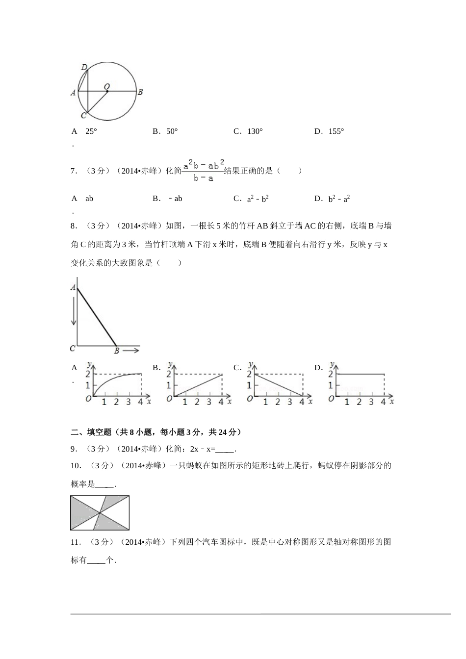 2014年内蒙古赤峰市中考数学试卷一、选择题(共8小题,每小题3分,共24分)1.(3分)(2014•赤峰)有理数﹣3的相反数是()A.3B.﹣3C.D.﹣2.(3分)(2014•赤峰)下面的几何体中,主(正)视图为三角形的是()A.B.C.D.3.(3分)(2014•赤峰)赤峰市改革开放以来经济建设取得巨大成就,2013年全市GDP总值为1686.15亿元,将1686.15亿元用科学记数法表示应为()A.168615×102元B.16.8615×104元C.1.68615×108元D.1.68615×1011元4.(3分)(2014•赤峰)下面是扬帆中学九年八班43名同学家庭人口的统计表:家庭人口数(人)34562学生人数(人)1510873这43个家庭人口的众数和中位数分别是()A.5,6B.3,4C.3,5D.4,65.(3分)(2014•赤峰)如图,把一块含有30°角(∠A=30°)的直角三角板ABC的直角顶点放在矩形桌面CDEF的一个顶点C处,桌面的另一个顶点F与三角板斜边相交于点F,如果∠1=40°,那么∠AFE=()A.50°B.40°C.20°D.10°6.(3分)(2014•赤峰)如图,AB是⊙O的直径,C,D是⊙O上两点,CD⊥AB.若∠DAB=65°,则∠BOC=()A.25°B.50°C.130°D.155°7.(3分)(2014•赤峰)化简结果正确的是()A.abB.﹣abC.a2b﹣2D.b2a﹣28.(3分)(2014•赤峰)如图,一根长5米的竹杆AB斜立于墙AC的右侧,底端B与墙角C的距离为3米,当竹杆顶端A下滑x米时,底端B便随着向右滑行y米,反映y与x变化关系的大致图象是()A.B.C.D.二、填空题(共8小题,每小题3分,共24分)9.(3分)(2014•赤峰)化简:2x﹣x=.10.(3分)(2014•赤峰)一只蚂蚁在如图所示的矩形地砖上爬行,蚂蚁停在阴影部分的概率是.11.(3分)(2014•赤峰)下列四个汽车图标中,既是中心对称图形又是轴对称图形的图标有个.12.(3分)(2014•赤峰)如图,E的矩形ABCD中BC边的中点,将△ABE沿AE折叠到△AEF,F在矩形ABCD内部,延长AF交DC于G点.若∠AEB=55°,求∠DAF=°.13.(3分)(2014•赤峰)如图,反比例函数y=(k>0)的图象与以原点(0,0)为圆心的圆交于A,B两点,且A(1,),图中阴影部分的面积等于.(结果保留π)14.(3分)(2014•赤峰)如图所示,在象棋盘上建立平面直角坐标系,使“马”位于点(2,2),“炮”位于点(﹣1,2),写出“兵”所在位置的坐标.15.(3分)(2014•赤峰)直线l过点M(﹣2,0),该直线的解析式可以写为.(只写出一个即可)16.(3分)(2014•赤峰)平移小菱形◇可以得到美丽的“中国结”图案,下面四个图案是由◇平移后得到的类似“中国结”的图案,按图中规律,第20个图案中,小菱形的个数是个.三、解答题(共10小题,满分102分)17.(6分)(2014•赤峰)计算:(π﹣)0+﹣8sin45°﹣()﹣1.18.(6分)(2014•赤峰)求不等式组的正整数解.19.(10分)(2014•赤峰)如图,已知△ABC中AB=AC.(1)作图:在AC上有一点D,延长BD,并在BD的延长线上取点E,使AE=AB,连AE,作∠EAC的平分线AF,AF交DE于点F(用尺规作图,保留作图痕迹,不写作法);(2)在(1)的条件下,连接CF,求证:∠E=∠ACF.20.(10分)(2014•赤峰)自从中央公布“八项规定”以来,光明中学积极开展“厉行节约,反对浪费”活动,为此,学校学生会对九年八班某日午饭浪费饭菜情况进行调查,调查内容分为四种:A.饭和菜全部吃光;B.有剩饭但菜吃光;C.饭吃光但菜有剩;D.饭和菜都有剩.学生会根据统计结果,绘制了如图两个统计图,根据统计图提供的信息回答下列问题:(1)九年八班共有多少名学生?(2)计算图2中B所在扇形的圆心角的度数,并补全条形统计图;(3)光明中学有学生2000名,请估计这顿午饭有剩饭的学生人数,按每人平均剩10克米饭计算,这顿午饭将浪费多少千克米饭?21.(10分)(2014•赤峰)位于赤峰市宁城的“大明塔”是我国辽代的佛塔,距今已有1千多年的历史.如图,王强同学为测量大明塔的高度,在地面的点E处测得塔基BC上端C的仰角为30°,他又沿BE方向走了26米,到达点F处,测得塔顶端A飞仰角为52°,已知塔基是以OB为半径的圆内接正八边形,B点在正八边形的一个顶点上,塔基半径OB=18米,...