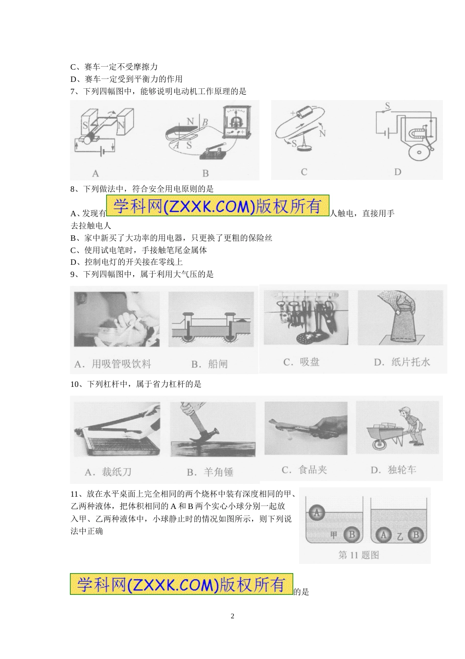 12013年铁岭市初中毕业生学业考试物理试卷理化考试时间共150分钟物理试卷满分120分考生注意;请在答题卡各题目规定答题区域内作答,答在本卷上无效。由昌图古于中学物理教师孙宝山编写答案联系QQ442912278第一部分选择题(共28分)一、选择题(本题共12小题,共28分,1~8题为单选题,每题2分;9~12题为多选题,每题3分,错选得0分)1.下列数据最接近实际的是A、一个书包重约为500NB、今年1月份辽宁地区的平均气温约为20ºCC、教室门的高度约为2mD、成人正常步行的速度约为5m/s2、下列现象中,属于光的反射的是3、下列有关能源和材料的说法中,正确的是A、核能是可再生能源B、潮汐能是化石能源C、超导材料可以用来制作电热丝D、利用纳米技术和纳米材料可以制造蜜蜂大小的直升机4、如图所示的电路图中,电源电压一定,闭合开关,滑动变阻器的滑片P从中点向上移动的过程中,以下说法正确的是A、电流表的示数变大,电压表的示数不变[来源:学科网]B、电流表的示数变小,电压表的示数不变C、电流表的示数变大、电压表的示数变小[来源:学科网ZXXK]D、电流表的示数变小,电压表的示数变大5、下列现象中,属于液化现象的是6、如图所示,是赛车在赛道上高速行驶的画面,其中一辆赛车在某段时间内,在水平赛道上做匀速直线运动。这段时间内,下列说法中正确的是A、赛车对赛道的压力与赛车受到的重力是一对平衡力B、赛车对赛道的压力与赛道对赛车的支持力是一对平衡力2C、赛车一定不受摩擦力D、赛车一定受到平衡力的作用7、下列四幅图中,能够说明电动机工作原理的是8、下列做法中,符合安全用电原则的是A、发现有人触电,直接用手去拉触电人B、家中新买了大功率的用电器,只更换了更粗的保险丝C、使用试电笔时,手接触笔尾金属体D、控制电灯的开关接在零线上9、下列四幅图中,属于利用大气压的是10、下列杠杆中,属于省力杠杆的是11、放在水平桌面上完全相同的两个烧杯中装有深度相同的甲、乙两种液体,把体积相同的A和B两个实心小球分别一起放入甲、乙两种液体中,小球静止时的情况如图所示,则下列说法中正确的是3A、在甲液体中,小球A受到的浮力大于小球B受到的浮力B、小球A的质量小于小球B的质量C、甲液体的密度大于乙液体的密度D、小球放入后,装甲液体的烧杯对桌面的压力小于装乙液体的烧杯对桌面的压力12、如图所示,电源电压不变,小灯泡L标有“6V3W”的字样(灯丝电阻不变)。R1=6Ω,三个开关都闭合时,小灯泡L正常发光,电流表示数为2A。关于此电路下列说法正确的是A、电源电压为6VB、电阻R2的阻值为6ΩC、闭合S3,断开S1和S2时,电流表的示数为0.5AD、闭合S3,断开S1和S2时,电压表的示数为2.4V第二部分非选择题(共92分)二、填空题(本题共9小题,每空1分,共26分)13、公园里,我们能听到小鸟的叫声,说明声音可以在________中传播。能够分辨出黄鹂鸟的叫声,是因为不同种类的鸟发出声音的________(选填“音调”、“响度”或“音色”)不同。我们看到各种颜色的花朵,是光的_____现象(选填“反射”或“折射”)。14、如图所示,小明和妈妈来到游乐场乘坐过山车,工作人员首先需要用电动机将过山车牵引到最高点,电能属于_______(选填“一次”或“二次”)能源;过山车快速运动时,小明感到天旋地转,他是以________为参照物。15、如图所示,2013年6月11日,我国成功发射“神舟十号”载人宇宙飞船,在整个发射过程中,飞船是通过_______与地面取得联系的;火箭上的摄像头相当于一个_______透镜,它的成像原理和我们生活中的______(选填“照相机”、“幻灯机”或“放大镜”)的成像原理相同。4516、如图所示是小明家的电能表,安装时的示数为零,到目前为止,小明家已消耗______KW·h的电能。小明断开其它用电器,只将“220V1000W”的电炉子接入电路,测得2min内电能表转盘转过81转,电炉子的实际功率为______W,此时电炉子两端的实际电压______(选填“大于”、“等于”或“小于”)它的额定电压。17、中国每年的端午节都有“赛龙舟”和“吃粽子”的习俗。这些习俗里蕴含着大量的物理知识,“赛龙舟”比赛时,向后划桨,龙舟向前运动,这说明物体间力的作用是________,还...