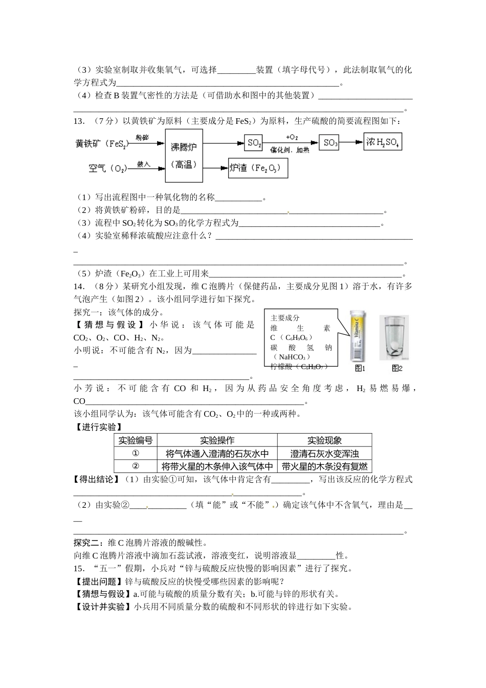 2013年安徽省初中毕业学业考试化学题号一二三总分得分注意事项:1.本卷共三大题16小题,满分60分。化学与物理的考试时间共120分钟。2.可能用到的相对原子质量:H-1C-12N-14O-16Cl-35.5Ca-40一、本大题包括10小题,每小题2分,共20分。每小题的4个选项中只有1个符合题意,请将选出的选项序号填入下面的答题表内。题号12345678910答案1.党的十八大报告提出建设“美丽中国”,我省各部门积极采取措施。下列做法正确的是A.力推火力发电B.焚烧塑料垃圾C.推广使用公共自行车D.使用一次性木筷2.青少年正处于生长发育期,需要摄取较多的蛋白质。下图中蛋白质含量最高的是A.橙子B.西红柿C.大豆D.玉米3.我国科学家用滤纸和二氧化钛(TiO2)薄膜制作出一种新型“纳米纸”,又在纳米纸上“铺”一层“萘胺”(C10H9N)染料,制成一种试纸,用于检测食品中亚硝酸盐浓度的高低。下列说法正确的是A.二氧化钛中Ti的化合价为+2B.萘胺中C、H、N的原子个数比为10:9:1C.二氧化钛和萘胺都是有机物D.这种试纸是一种新型化合物4.下列实验操作正确的是A.滴加液体B.取用固体C.测溶液pHD.过滤5.二氧化碳和氢气可在一定条件下反应,生成一种重要的化工原料甲醇:CO2+3H2CH3OH+H2O。下列有关该反应的说法正确的是A.为CO2的利用创造了一种新途径B.钌-膦铬合物的质量在反应前后发生了变化C.氢原子数在反应前后发生了改变D.属于复分解反应得分评卷人6.2013年“世界水日”和“中国水周”活动的宣传主题为“节约保护水资源,大力建设生态文明”。下列说法正确的是A.保护水资源,禁止使用化肥、农药B.利用沉降的方法,将硬水转化成软水C.工业废渣的任意排放,不会污染水体D.城市浇花,使用喷灌、滴灌技术7.最近科学家用钙原子轰击铕原子,合成117号元素(部分信息如图所示)。下列说法错误的是A.该元素的相对原子质量为294gB.该元素的原子序数为117C.该元素的核外电子数为117D.钙和铕都属于金属元素8.自然界中有几千万种含碳物质,并循环转化。下列说法正确的是A.人的生命活动离不开碳循环B.森林的减少对碳的循环没有影响C.金刚石中碳原子间没有间隔D.地下的煤中碳原子是静止不动的9.分类法是学习化学的一种方法。下列不属于分类方法的是A.物质可分为纯净物和混合物,纯净物又可分为单质和化合物B.有机高分子材料可分为天然有机高分子材料和合成有机高分子材料C.人体中的元素可分为常量元素和微量元素D.空气可分为氮气、氧气、稀有气体、二氧化碳、其他气体和杂质10.下图表示某物质在水(a)和酒精(b)中的溶解度曲线。下列有关该物质的说法正确的是A.在水和酒精中的溶解度相同B.在水和酒精中的溶解度都随温度的升高而增大C.20℃时,其水溶液比其酒精溶液的溶质质量分数大D.40℃时,其水溶液的溶质质量分数为38%二、本大题包括5小题,共34分。11.(6分)铁锅、铝锅是生活中常用的炊具,右图是铁锅的示意图。(1)铁锅含有合金单质_______(写化学式),含有的有机合成材料是_________。(2)炒菜时铁锅中的油着火可用锅盖盖灭,其原理是_______________________________________________。(3)铝锅轻便、耐用,其原因是___________________、____________________________________________________________________________。(4)废旧铁锅、铝锅不要随意丢弃,应回收利用,这样做的意义是_________________。12.(7分)空气是人类活动必需的自然资源。工业上常用分离空气的方法制取氧气,实验室常用物质分解的方法制取氧气。ABCDE(1)工业制氧气是变化________(填“物理”或“化学”)变化。(2)图中仪器a的名称是___________。(3)实验室制取并收集氧气,可选择_________装置(填字母代号),此法制取氧气的化学方程式为____________________________________________________。(4)检查B装置气密性的方法是(可借助水和图中的其他装置)___________________________________________________________________________________________________。13.(7分)以黄铁矿为原料(主要成分是FeS2)为原料,生产硫酸的简要流程图如下:(1)写出流程图中一种...